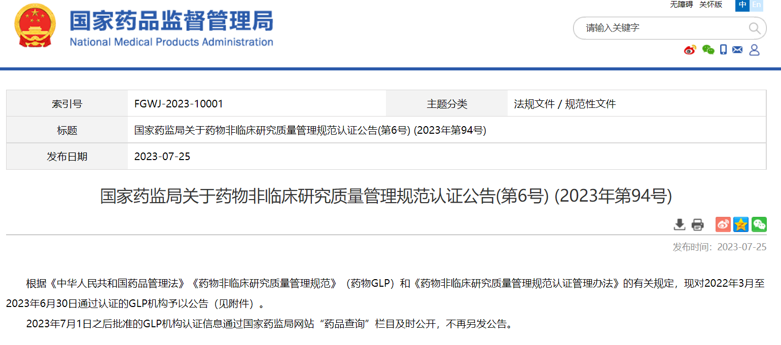 國家藥監(jiān)局關(guān)于藥物非臨床研究質(zhì)量管理規(guī)范認(rèn)證公告(第6號) (2023年第94號)