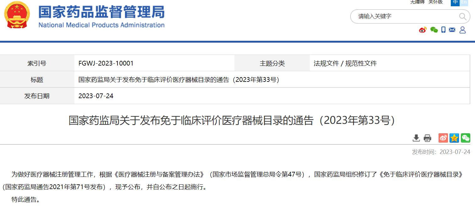 國家藥監(jiān)局關(guān)于發(fā)布免于臨床評價醫(yī)療器械目錄的通告(2023年第33號)