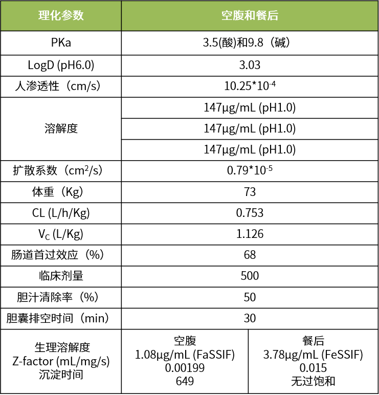 甲苯咪唑是一種口服藥物,具有中等親脂性,該化合物具有很強(qiáng)的pH依賴性,在酸性環(huán)境(pH 1.0)中溶解度為147μg/mL,在中性環(huán)境(pH 7.0)中溶解度為0.67 μg/mL,在堿性環(huán)境(pH 12.5)中溶解度為187 μg/mL,在空腹?fàn)顟B(tài)模擬腸液中測(cè)定的溶解度為1.08 mg/mL,在餐后狀態(tài)模擬腸液中測(cè)定的溶解度為3.78 mg/mL,該化合物的滲透率估計(jì)很高(Human Peff 10.25*10 ^4cm/s)導(dǎo)致BCS II分類,溶出模型選擇Z-factor模型。