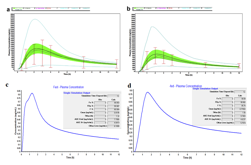 說明:a和b是參考文獻(xiàn)中案例4的軟件模擬和預(yù)測(cè)值,c和d是小編建模模擬值,小編在模擬過程中發(fā)現(xiàn)針對(duì)BCSII類弱堿性化合物,溶出模型選擇Johnson模型時(shí),pH對(duì)應(yīng)溶解度對(duì)模擬結(jié)果影響很大,小編輸入pH1對(duì)應(yīng)溶解度與結(jié)果擬合較好,為了與文獻(xiàn)值相似,小編也同文獻(xiàn)將腸液體積從GastroPlus™的默認(rèn)值進(jìn)行調(diào)整,Cmax模擬結(jié)果與文獻(xiàn)相似。