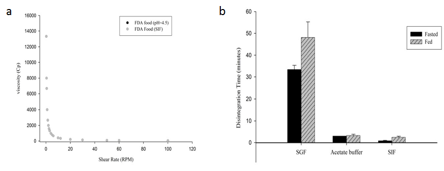 圖1 a:標(biāo)準(zhǔn)高脂餐(醋酸鹽和磷酸鹽緩沖液)在不同剪切速率下的粘度;b:克拉霉素在不同介質(zhì)中的平均崩解時(shí)間