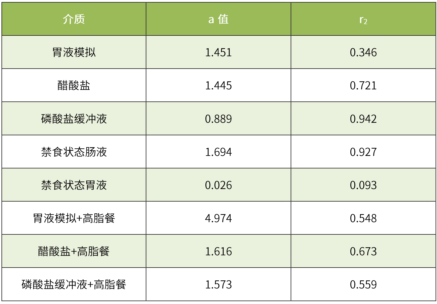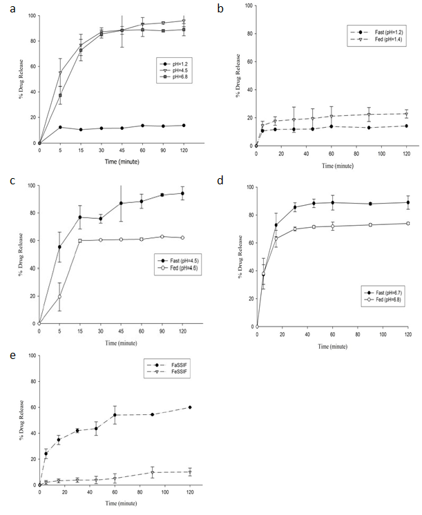 研究表明食物對(duì)藥物的釋放和片劑的崩解具有顯著影響,由于pH和膽酸鹽濃度變化,含有標(biāo)準(zhǔn)高脂餐的介質(zhì)和生理相關(guān)介質(zhì)中的溶出差異顯著。