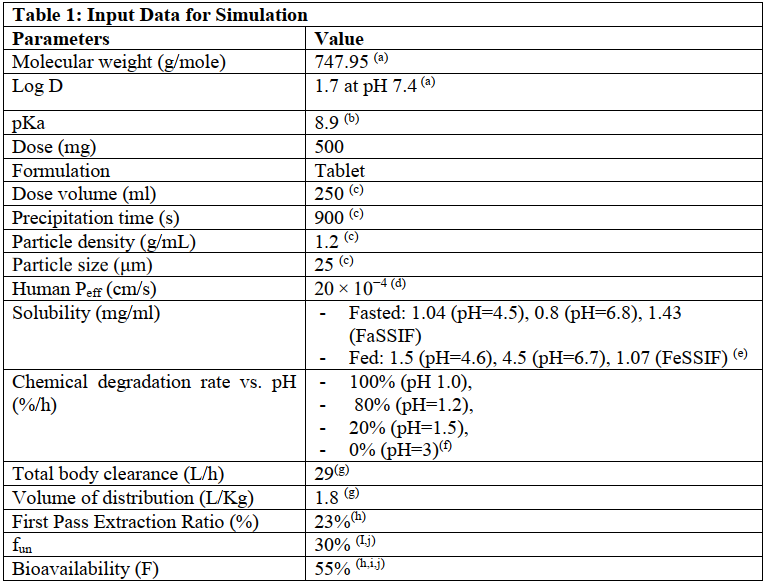 ? 敏感性分析:選擇參數(shù)溶解性、滲透性、胃排空速率、胃腸pH、胃排空時(shí)間、總清除率、肝腸首過(guò)效應(yīng)(FPE)對(duì)空腹及餐后試驗(yàn)條件下克拉霉素的吸收進(jìn)行敏感性分析。根據(jù)結(jié)果,清除率、肝臟首過(guò)效應(yīng)和腸道首過(guò)效應(yīng)對(duì)克拉霉素的Cmax及AUC具有顯著影響。然而,溶解性、滲透性、胃腸pH對(duì)克拉霉素的吸收無(wú)影響。餐后試驗(yàn)條件下,Cmax受胃排空速率影響,Cmax隨胃滯留時(shí)間延長(zhǎng)而降低。經(jīng)敏感性分析發(fā)現(xiàn),廣泛的肝臟代謝和腸道首過(guò)效應(yīng)可能會(huì)導(dǎo)致PK參數(shù)大幅度的下降,給藥后肝血流量增加也會(huì)降低肝提取率并增大藥物生物利用度。