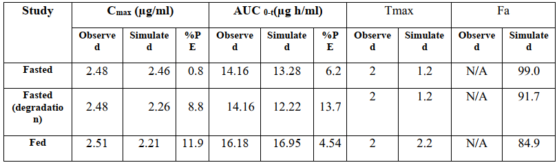 GastroPlus軟件模擬的濃度-時(shí)間曲線(xiàn)與體內(nèi)觀(guān)測(cè)數(shù)據(jù)吻合良好,該模型具有較好的預(yù)測(cè)性。小編運(yùn)用實(shí)際PK數(shù)據(jù)進(jìn)行模型驗(yàn)證,也表明該模型預(yù)測(cè)性良好。這些發(fā)現(xiàn)表明,體外和PBPK方法可作為預(yù)測(cè)口服藥物食物效應(yīng)的可靠工具,在開(kāi)發(fā)仿制藥過(guò)程中,可無(wú)需過(guò)多的耗時(shí)和進(jìn)行昂貴的臨床研究。