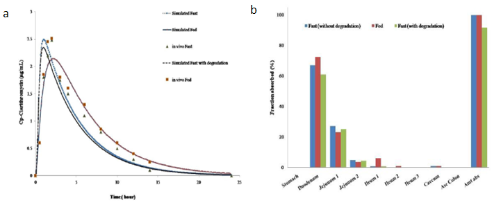 研究藥物的酸降解對(duì)克拉霉素口服生物利用度的影響發(fā)現(xiàn),考慮酸降解時(shí)Cmax和AUC減小??死顾卦谖改c道吸收快速,且模型預(yù)測(cè)空腹條件下克拉霉素吸收分?jǐn)?shù)為91.6%,餐后條件下吸收100%??紤]原因?yàn)榭死顾卦谖竝H環(huán)境中不穩(wěn)定,降低了藥物的吸收。空腹?fàn)顟B(tài)下克拉霉素67.1%吸收分布在十二指腸,27.1%的劑量在空腸。餐后狀態(tài)下,克拉霉素吸收完全,由于膽汁再攝取增強(qiáng),73.7%劑量比例吸收分布在十二指腸,22.1%分布在空腸。