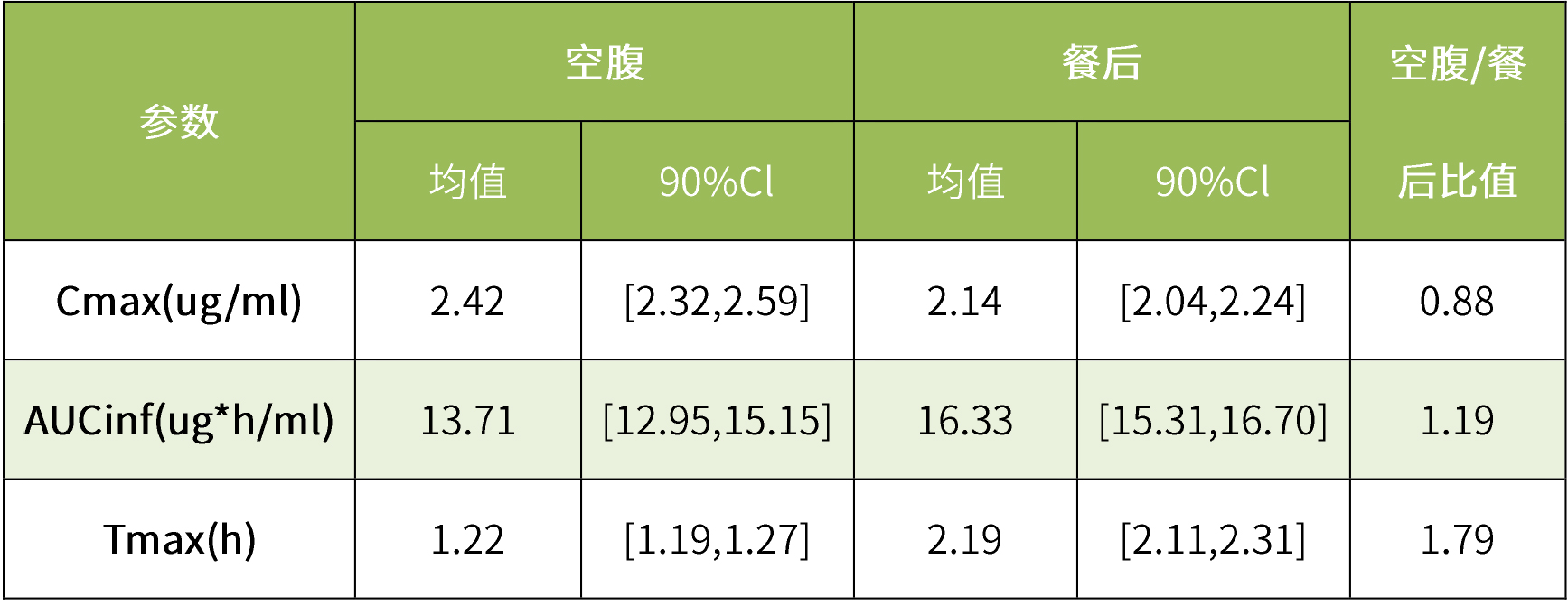虛擬BE模擬結(jié)果表明,食物對(duì)克拉霉素生物利用度無(wú)顯著影響。克拉霉素片在空腹和餐后狀態(tài)下的平均血漿濃度-時(shí)間曲線(xiàn)均落在90%置信區(qū)間內(nèi)。虛擬人群試驗(yàn)表明,食物不會(huì)顯著改變克拉霉素片的Cmax和AUC,空腹與餐后的Cmax和AUC的90%置信區(qū)間均在生物等效性限值內(nèi)。