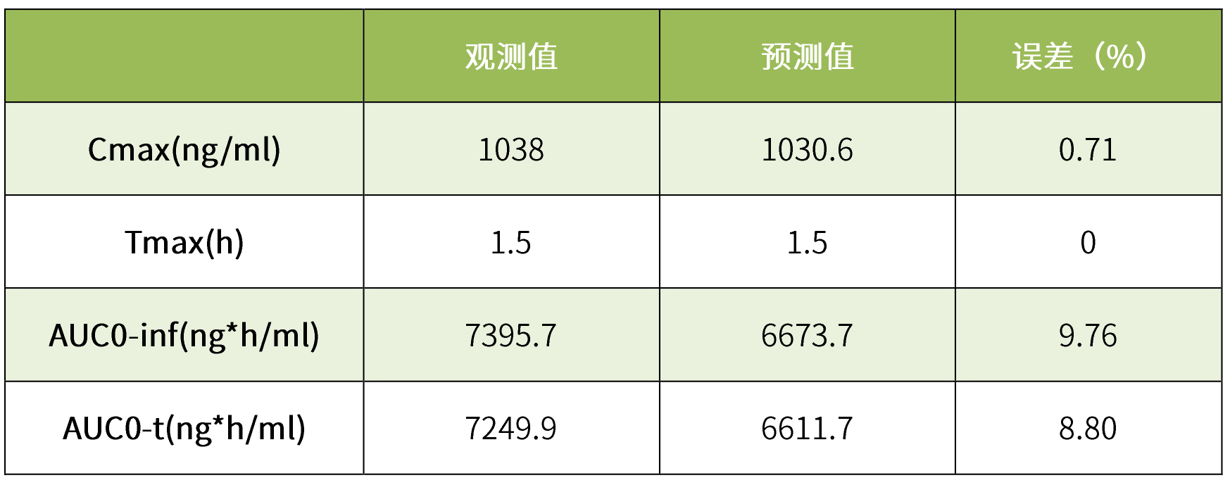 我司擁有國(guó)內(nèi)首個(gè)體內(nèi)外橋接(IVIVR)研發(fā)平臺(tái),不僅擁有Gastroplus軟件,而且完成了克拉霉素片仿制藥的申報(bào)。小編這里運(yùn)用GastroPlus軟件的PBPK模型對(duì)克拉霉素片進(jìn)行模型驗(yàn)證。將我司獲得的餐后狀態(tài)下的體內(nèi)PK數(shù)據(jù)輸入該模型中,模擬結(jié)果見(jiàn)表6。根據(jù)結(jié)果可知,我司取得的餐后PK數(shù)據(jù)與模型觀(guān)測(cè)值擬合度極高,誤差小于10%,二者血漿濃度藥時(shí)曲線(xiàn)也幾乎完全吻合,標(biāo)明該模型具有良好的預(yù)測(cè)性。