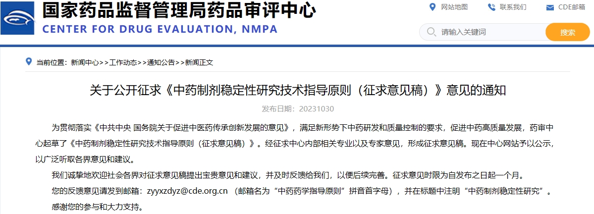 關(guān)于公開(kāi)征求《中藥制劑穩(wěn)定性研究技術(shù)指導(dǎo)原則(征求意見(jiàn)稿)》意見(jiàn)的通知