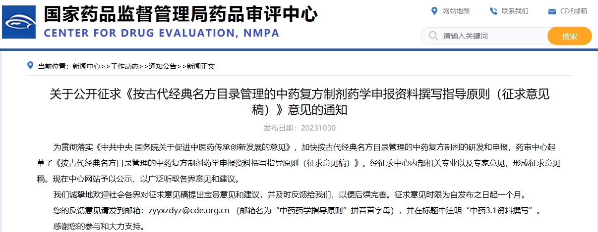 關(guān)于公開(kāi)征求《按古代經(jīng)典名方目錄管理的中藥復(fù)方制劑藥學(xué)申報(bào)資料撰寫(xiě)指導(dǎo)原則(征求意見(jiàn)稿)》意見(jiàn)的通知
