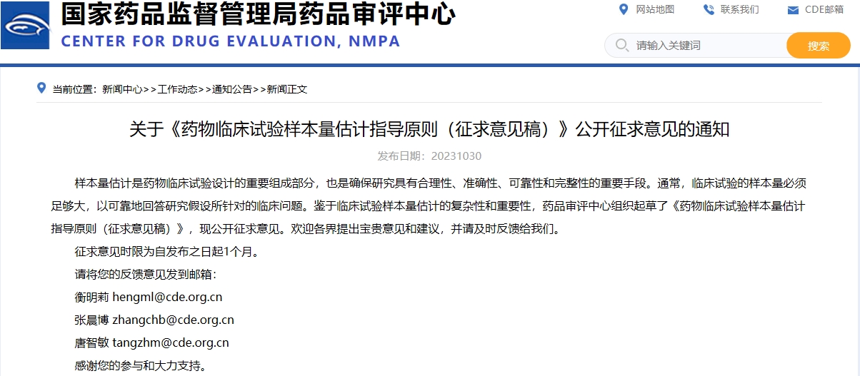 關(guān)于《藥物臨床試驗(yàn)樣本量估計(jì)指導(dǎo)原則(征求意見(jiàn)稿)》公開(kāi)征求意見(jiàn)的通知