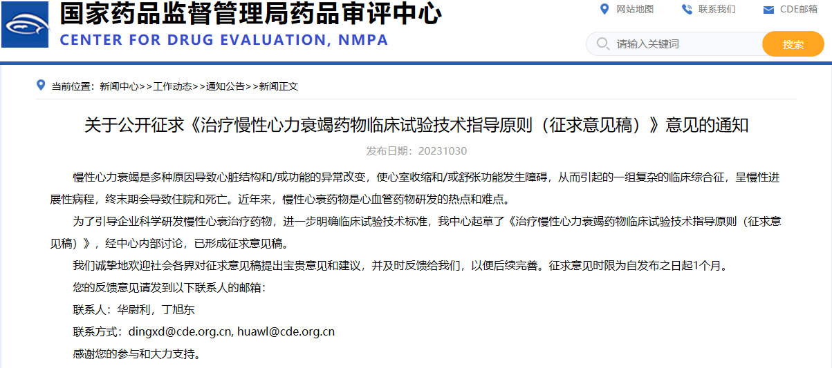 關(guān)于公開(kāi)征求《治療慢性心力衰竭藥物臨床試驗(yàn)技術(shù)指導(dǎo)原則(征求意見(jiàn)稿)》意見(jiàn)的通知