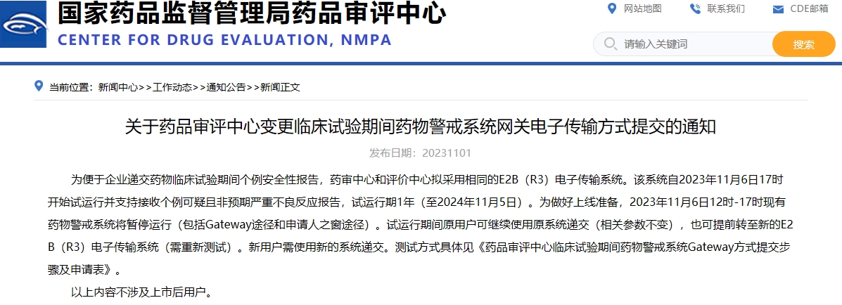 關(guān)于藥品審評(píng)中心變更臨床試驗(yàn)期間藥物警戒系統(tǒng)網(wǎng)關(guān)電子傳輸方式提交的通知