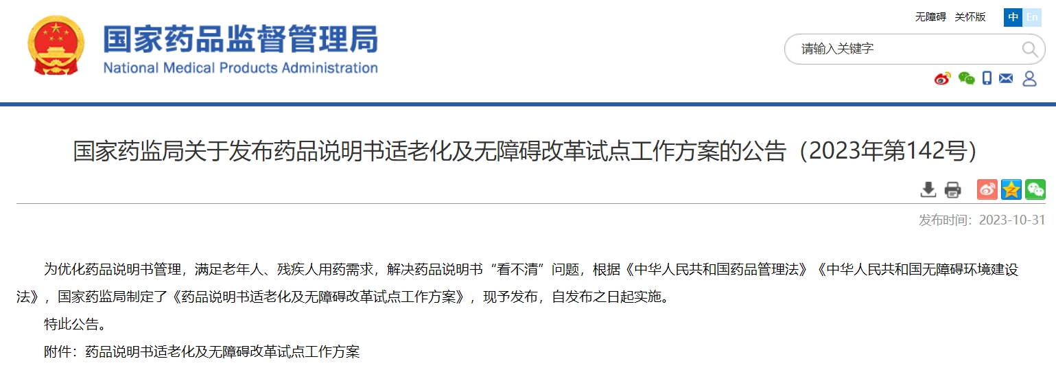 國(guó)家藥監(jiān)局關(guān)于發(fā)布藥品說(shuō)明書(shū)適老化及無(wú)障礙改革試點(diǎn)工作方案的公告(2023年第142號(hào))