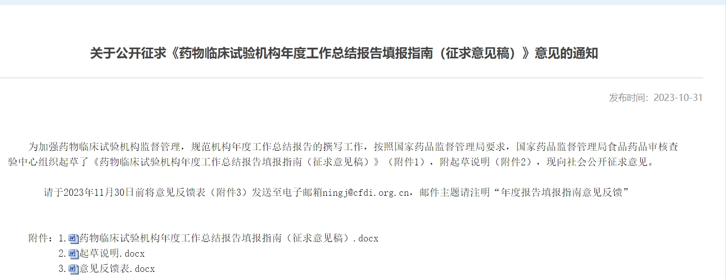 關(guān)于公開(kāi)征求《藥物臨床試驗(yàn)機(jī)構(gòu)年度工作總結(jié)報(bào)告填報(bào)指南(征求意見(jiàn)稿)》意見(jiàn)的通知