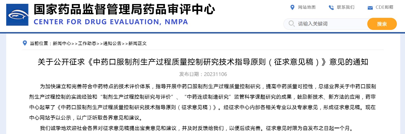關(guān)于公開征求《中藥口服制劑生產(chǎn)過程質(zhì)量控制研究技術(shù)指導(dǎo)原則(征求意見稿)》意見的通知