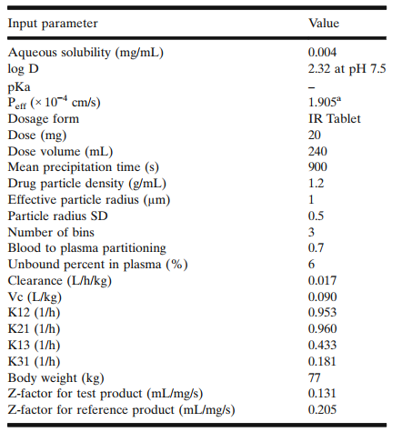 對于預測不同晶型的藥動,需要將不同晶型的數據納入至模型中去,如水溶性、FaSSIF和FeSSIF的溶解性和溶出曲線、粒徑等。當然我們也有不知道的數據,如參比制劑的粒徑的數據,這些數據均有可能會影響藥物在體內的吸收,我們決定采用Z-factor模型用于代表不同晶型的體外溶出模型。