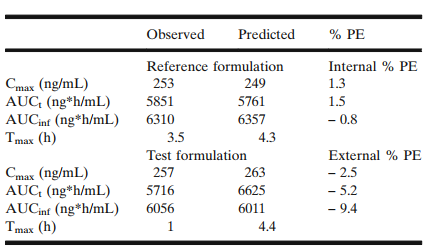 采用參比制劑的PK和體外數據,建立模型,并采用該模型,進行內部驗證,PE小于10%,符合FDA的指導原則。根據該原則,可以建立IVIVC。采用IVIVC模型,模擬每個處方,要求模擬的結果和實測值的PE不超過15%,該模型可以用于模擬仿制藥的血藥濃度。