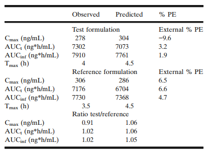 采用上述模型,32例受試者進行虛擬BE試驗,仿制藥和參比制劑的Cmax和AUC均為80.00%-125.00%范圍內,兩者具有生物等效性。外部驗證的模型PE值小于10%。