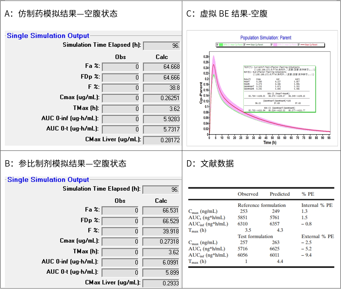 新領先參考文獻值進行建模和模擬兩個制劑的PK參數,Cmax和AUC采用單位分別為ug/ml和ug*h/ml,而文獻中兩個參數采用的單位分別為ng/ml和ng*h/ml,無論空腹和餐后,新領先預測Cmax和AUC與文獻值報道無顯著性差異。