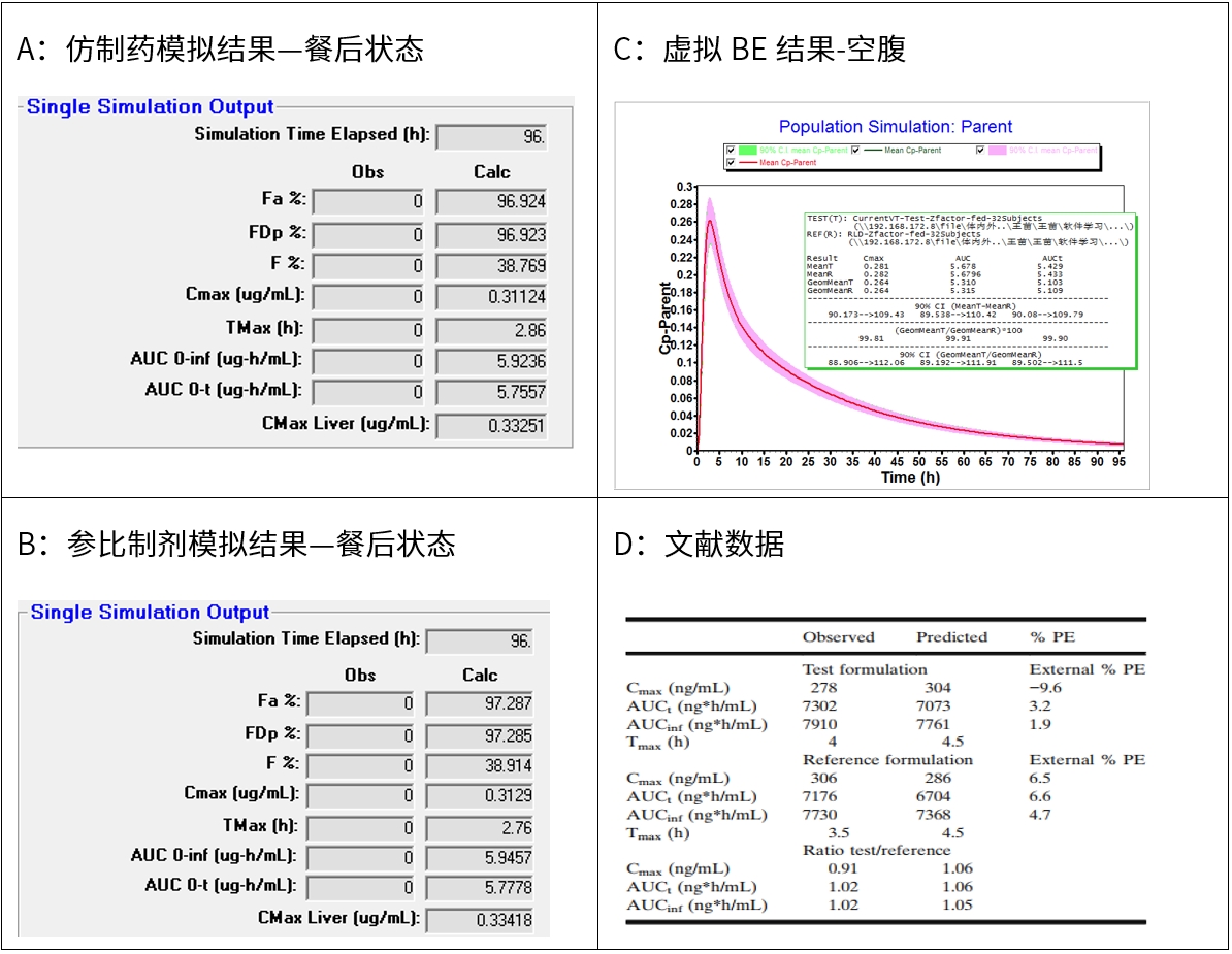參考文獻數據,仿制藥的Z-factor數據為0.131,參比制劑Z-factor值為0.205,模擬經驗Z-factor值越高,模擬結果越高,即參比吸收要比仿制藥好,新領先模擬結果具有該趨勢。可能由于模型中數據缺乏,我方模擬趨勢與文獻趨勢相反。