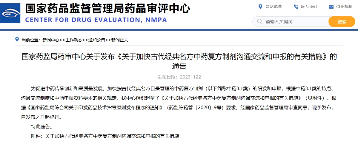國家藥監(jiān)局藥審中心關于發(fā)布《關于加快古代經典名方中藥復方制劑溝通交流和申報的有關措施》的通告