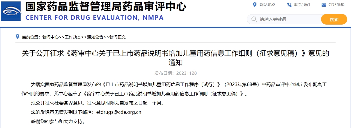 關(guān)于公開(kāi)征求《藥審中心關(guān)于已上市藥品說(shuō)明書(shū)增加兒童用藥信息工作細(xì)則(征求意見(jiàn)稿)》意見(jiàn)的通知