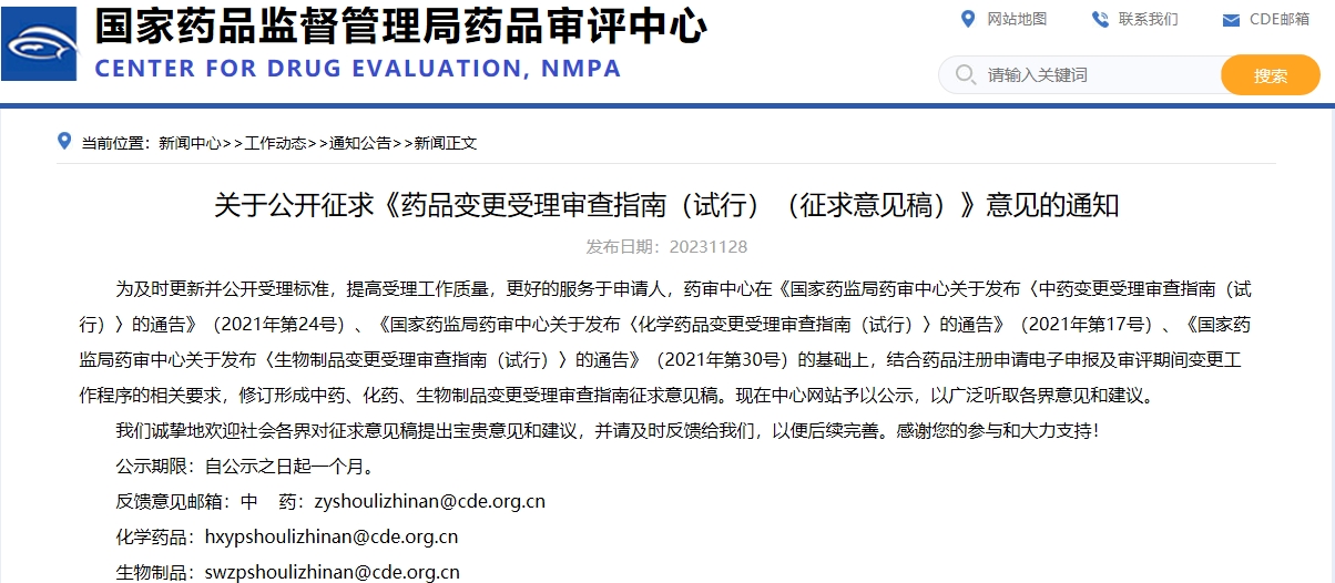 關(guān)于公開(kāi)征求《藥品變更受理審查指南(試行)(征求意見(jiàn)稿)》意見(jiàn)的通知
