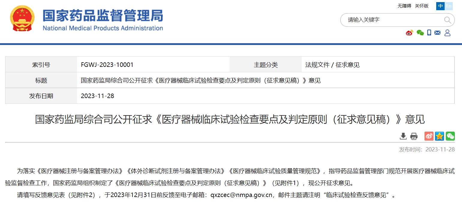 國(guó)家藥監(jiān)局綜合司公開(kāi)征求《醫(yī)療器械臨床試驗(yàn)檢查要點(diǎn)及判定原則(征求意見(jiàn)稿)》意見(jiàn)