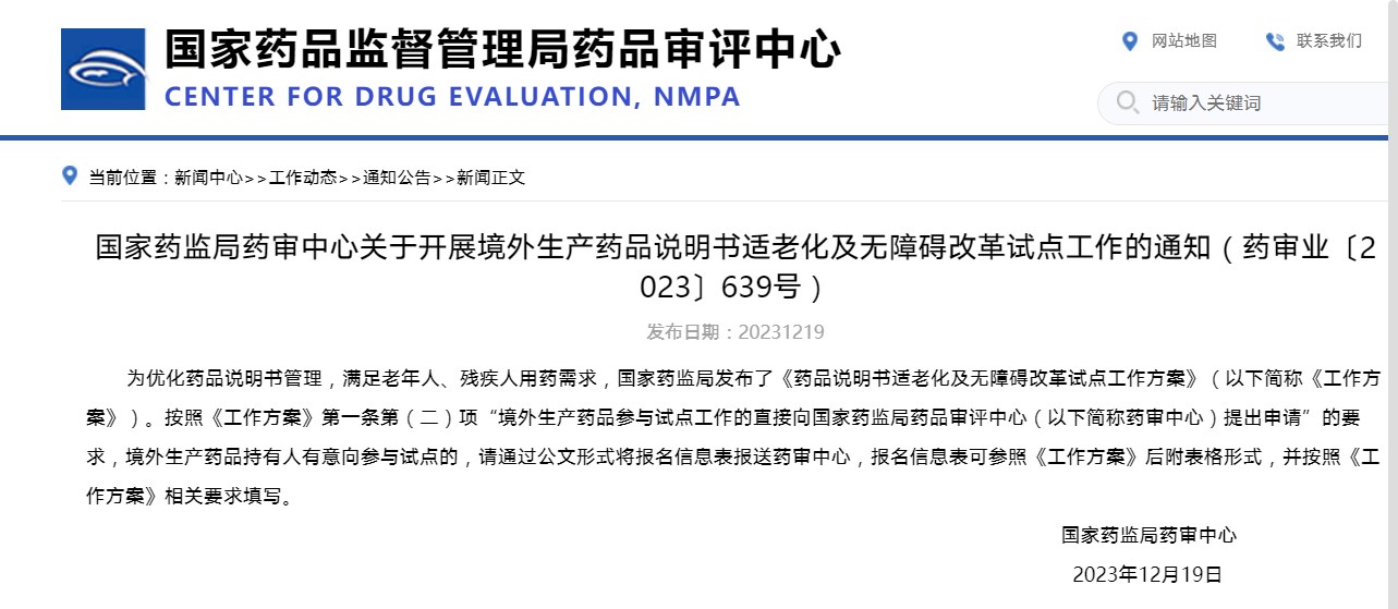 國(guó)家藥監(jiān)局藥審中心關(guān)于開(kāi)展境外生產(chǎn)藥品說(shuō)明書(shū)適老化及無(wú)障礙改革試點(diǎn)工作的通知(藥審業(yè)〔2023〕639號(hào))