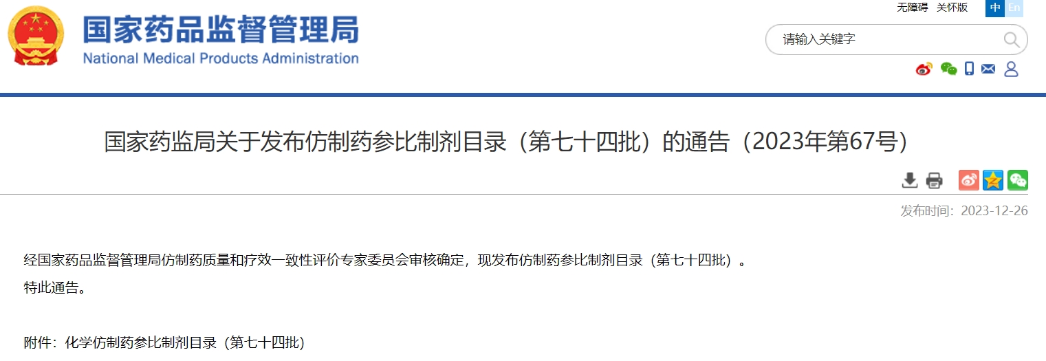 國家藥監(jiān)局關(guān)于發(fā)布仿制藥參比制劑目錄(第七十四批)的通告(2023年第67號)