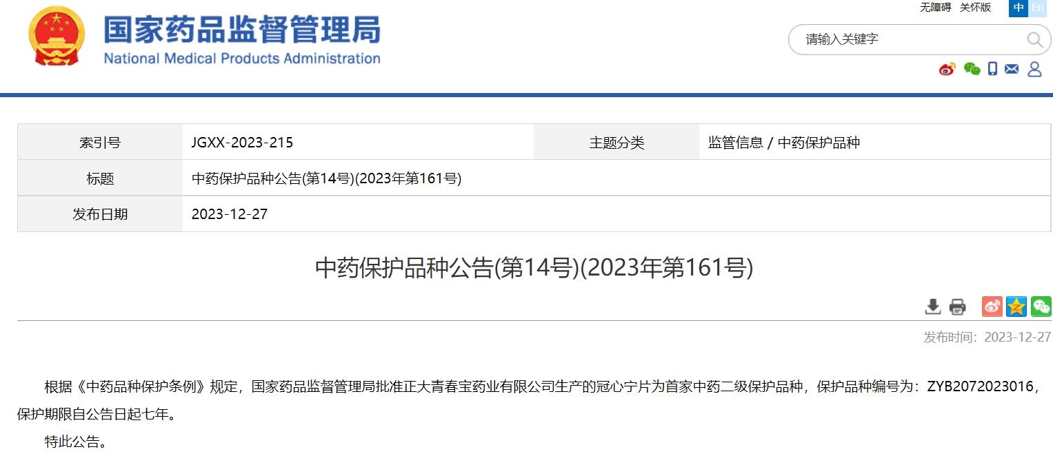 中藥保護(hù)品種公告(第14號)(2023年第161號)
