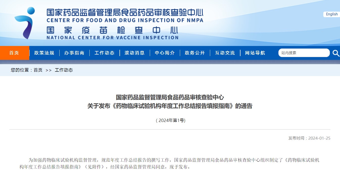 國家藥品監(jiān)督管理局食品藥品審核查驗中心關于發(fā)布《藥物臨床試驗機構年度工作總結報告填報指南》的通告