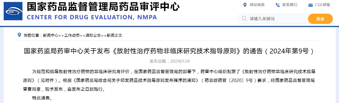 國家藥監(jiān)局藥審中心關于發(fā)布《放射性治療藥物非臨床研究技術指導原則》的通告(2024年第9號)