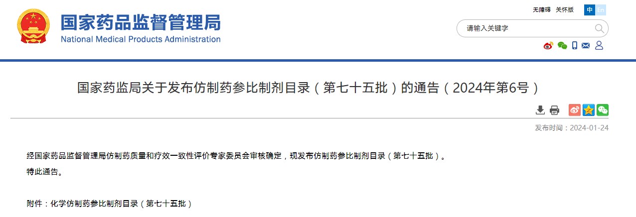 國家藥監(jiān)局關于發(fā)布仿制藥參比制劑目錄(第七十五批)的通告(2024年第6號)