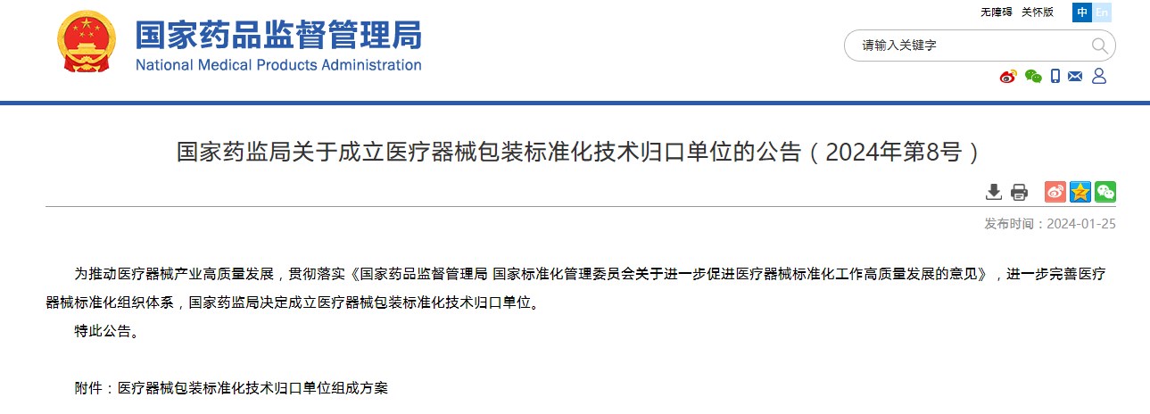 國家藥監(jiān)局關于成立醫(yī)療器械包裝標準化技術歸口單位的公告(2024年第8號)