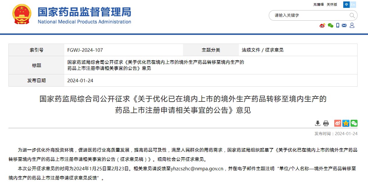 國家藥監(jiān)局綜合司公開征求《關于優(yōu)化已在境內(nèi)上市的境外生產(chǎn)藥品轉(zhuǎn)移至境內(nèi)生產(chǎn)的藥品上市注冊申請相關事宜的公告》意見