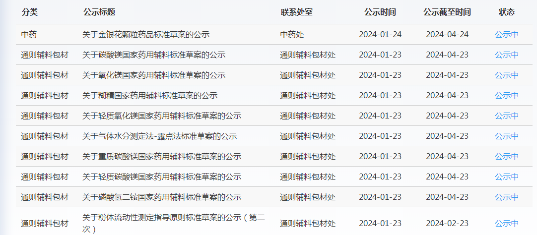 本周藥典委發(fā)布關于金銀花顆粒等5個品種藥品標準草案,碳酸鎂等5個品種藥用輔料標準草案,以及關于粉體流動性測定指導原則標準草案、藥品包裝用陶瓷吸水率測定法標準草案、藥品包裝用陶瓷瓶及組件通則的公示。