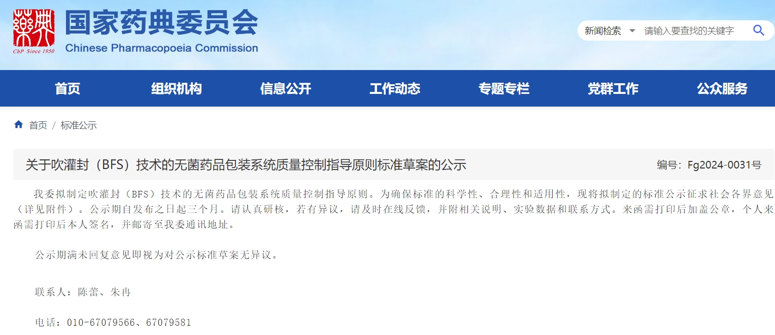 關于吹灌封(BFS)技術的無菌藥品包裝系統(tǒng)質量控制指導原則標準草案的公示