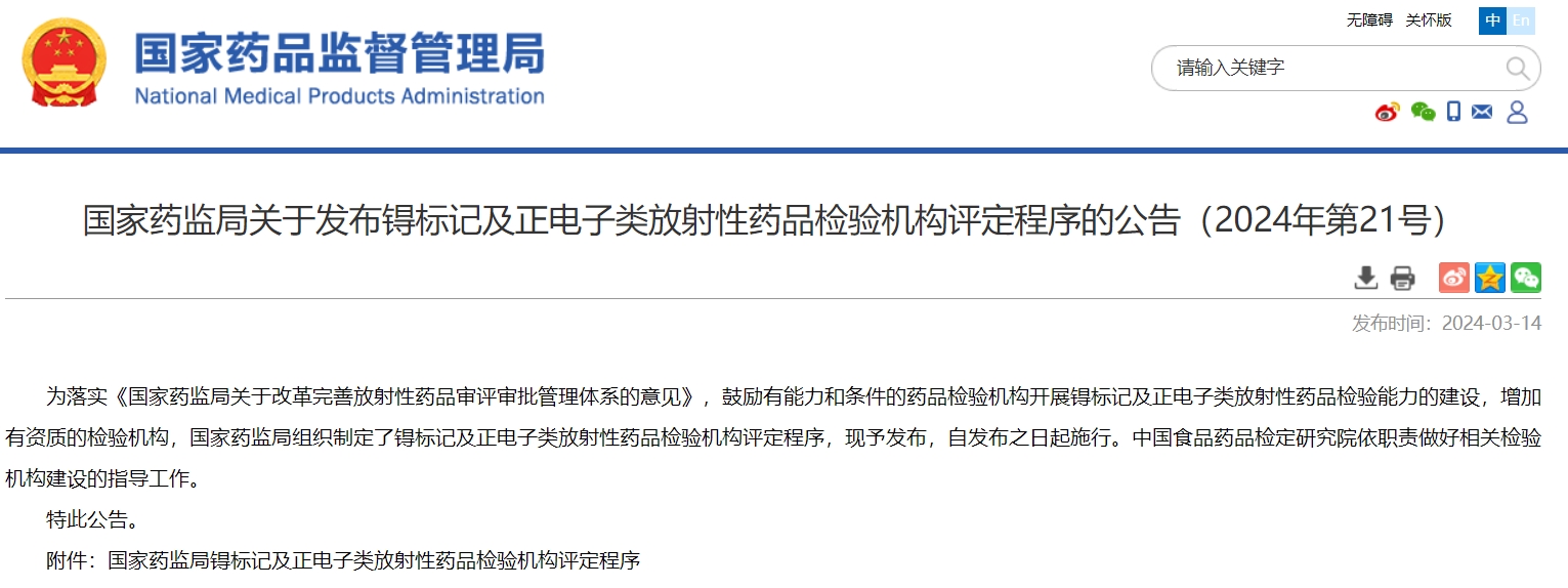 國家藥監(jiān)局關(guān)于發(fā)布锝標記及正電子類放射性藥品檢驗機構(gòu)評定程序的公告(2024年第21號)