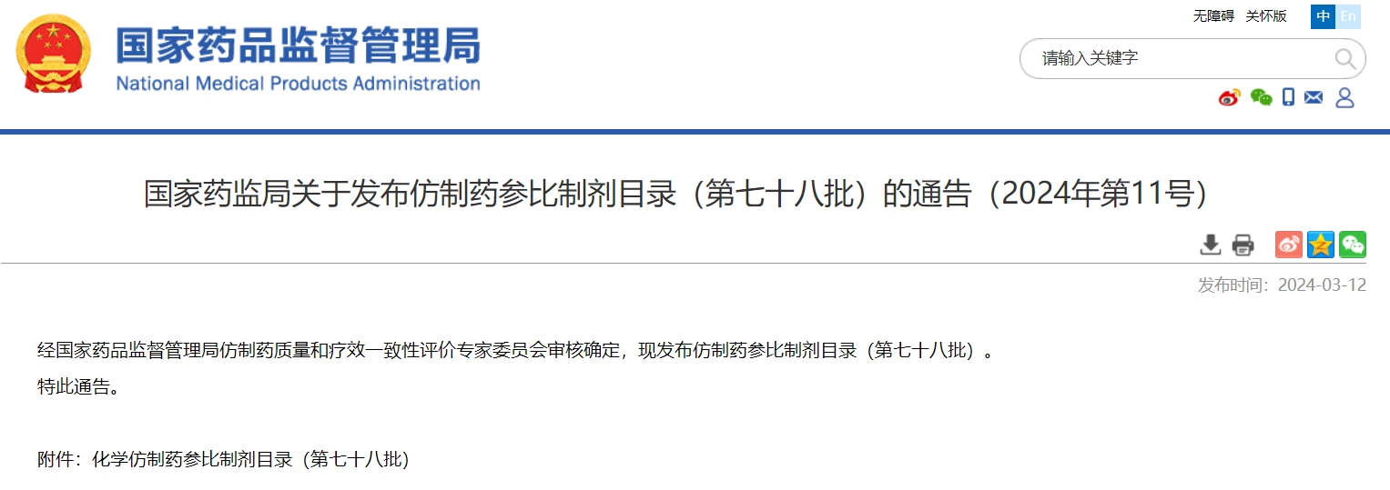 國家藥監(jiān)局關(guān)于發(fā)布仿制藥參比制劑目錄(第七十八批)的通告(2024年第11號)