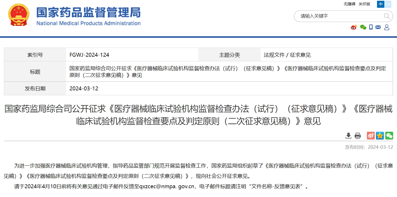 國家藥監(jiān)局綜合司公開征求《醫(yī)療器械臨床試驗機構(gòu)監(jiān)督檢查辦法(試行)(征求意見稿)》《醫(yī)療器械臨床試驗機構(gòu)監(jiān)督檢查要點及判定原則(二次征求意見稿)》意見
