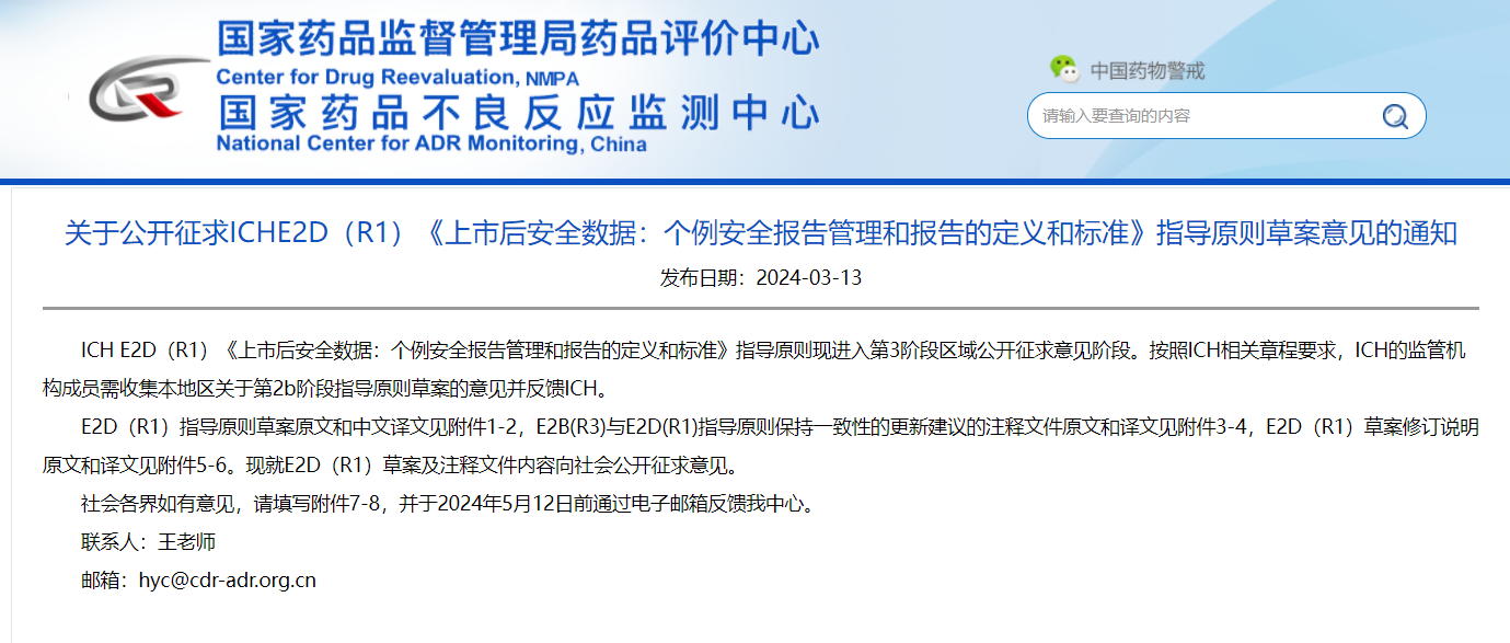 關(guān)于公開征求ICHE2D(R1)《上市后安全數(shù)據(jù):個例安全報告管理和報告的定義和標準》指導原則草案意見的通知