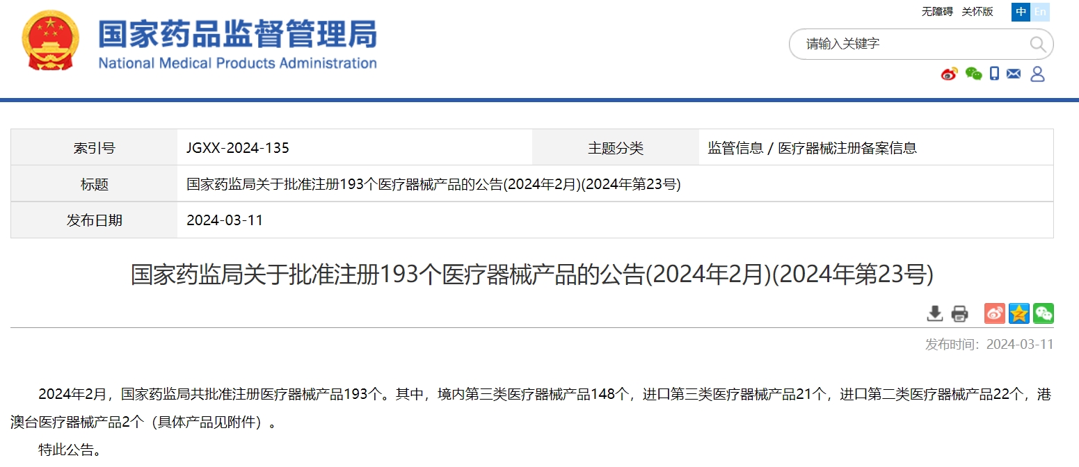 國家藥監(jiān)局關(guān)于批準注冊193個醫(yī)療器械產(chǎn)品的公告(2024年2月)(2024年第23號)