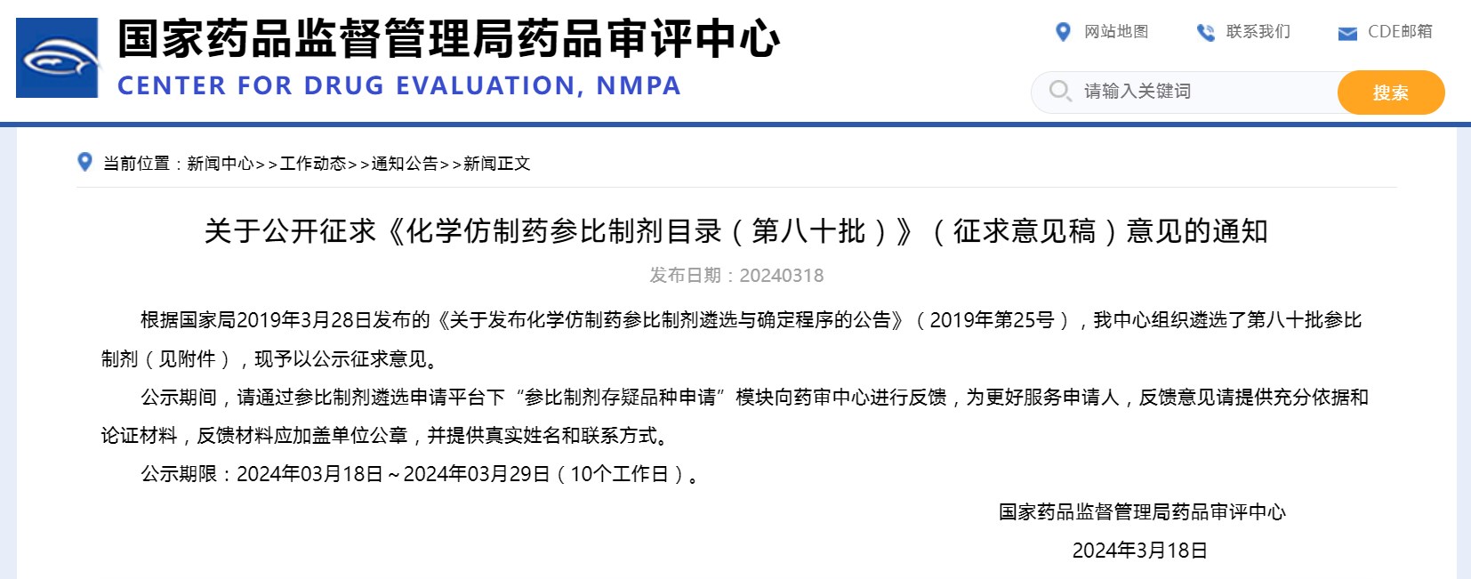 關(guān)于公開征求《化學(xué)仿制藥參比制劑目錄(第八十批)》(征求意見稿)意見的通知