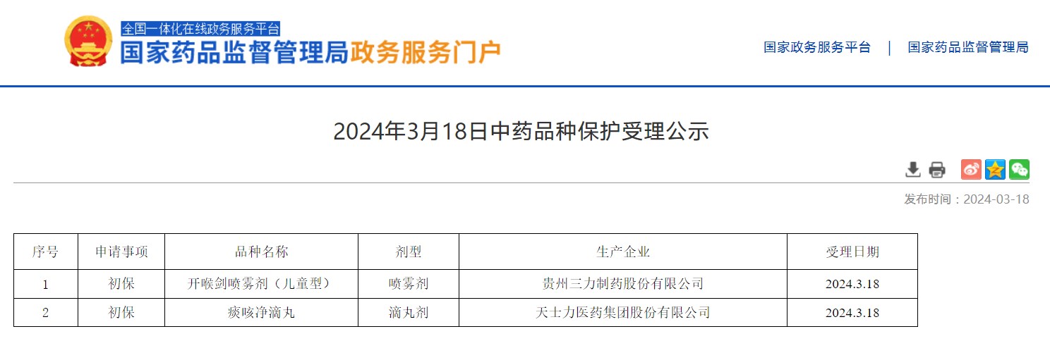 2024年03月22日中藥品種保護受理公示