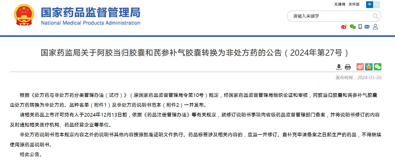 國家藥監(jiān)局關(guān)于阿膠當(dāng)歸膠囊和芪參補氣膠囊轉(zhuǎn)換為非處方藥的公告(2024年第27號)