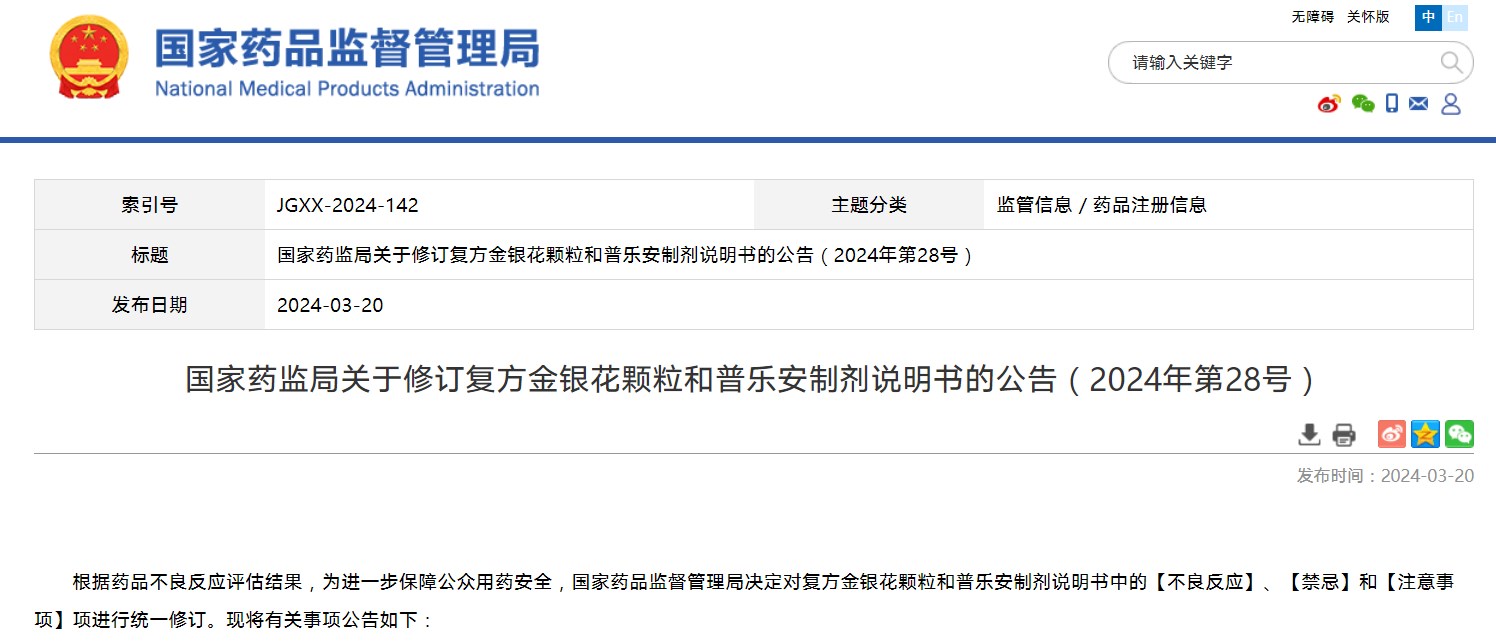 國家藥監(jiān)局關(guān)于修訂復(fù)方金銀花顆粒和普樂安制劑說明書的公告(2024年第28號)