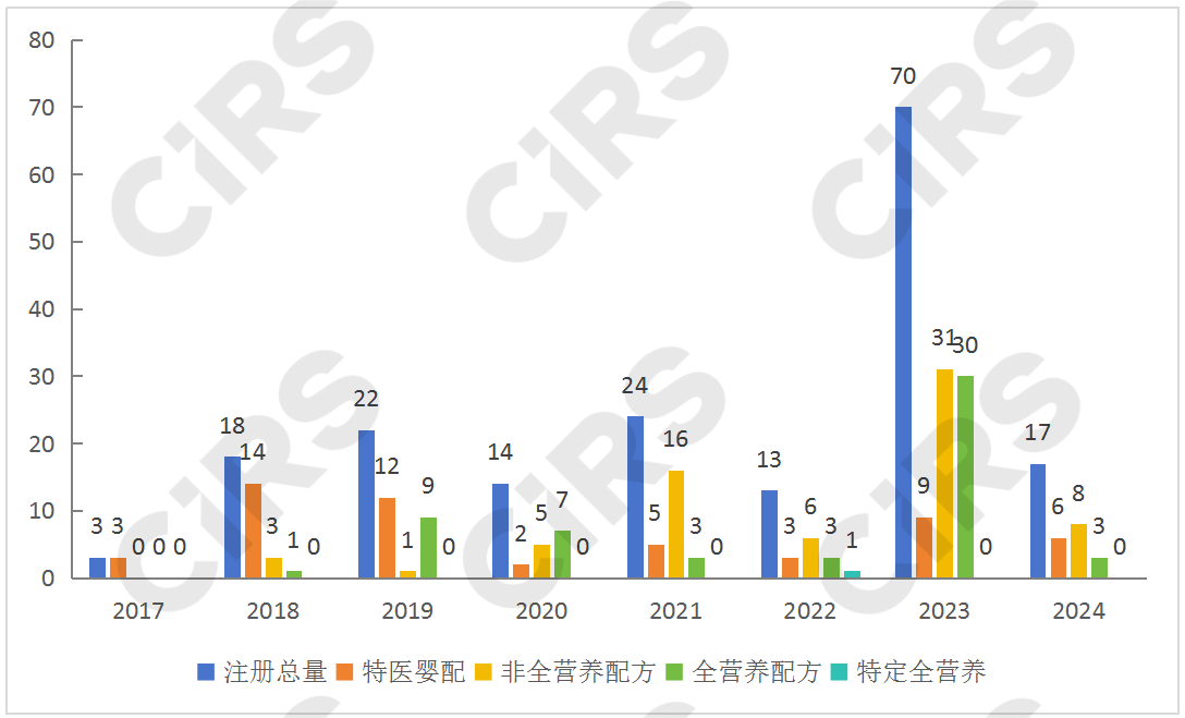 自2017年第一款特醫(yī)嬰配產(chǎn)品注冊成功后,特醫(yī)食品注冊大門正式打開。下圖可知,特醫(yī)嬰配呈現(xiàn)高開低走的趨勢,其注冊主要集中于2018年和2019年,非全營養(yǎng)配方的注冊則集中于2021和2023年。2022年總注冊量較少,但注冊產(chǎn)品類型增多,且新增了首款特定全營養(yǎng)配方食品。2023年新增了首款增稠組件,注冊類型主要集中于全營養(yǎng)和非全營養(yǎng)產(chǎn)品,其占比高達(dá)87%。相比2022年注冊量,2023年呈現(xiàn)爆發(fā)式增長。2024年第一季度已新增17款產(chǎn)品,由此可見2024年的產(chǎn)品獲批勢頭強(qiáng)勁,而特定全營養(yǎng)食品依然是需要繼續(xù)突破的大關(guān)。