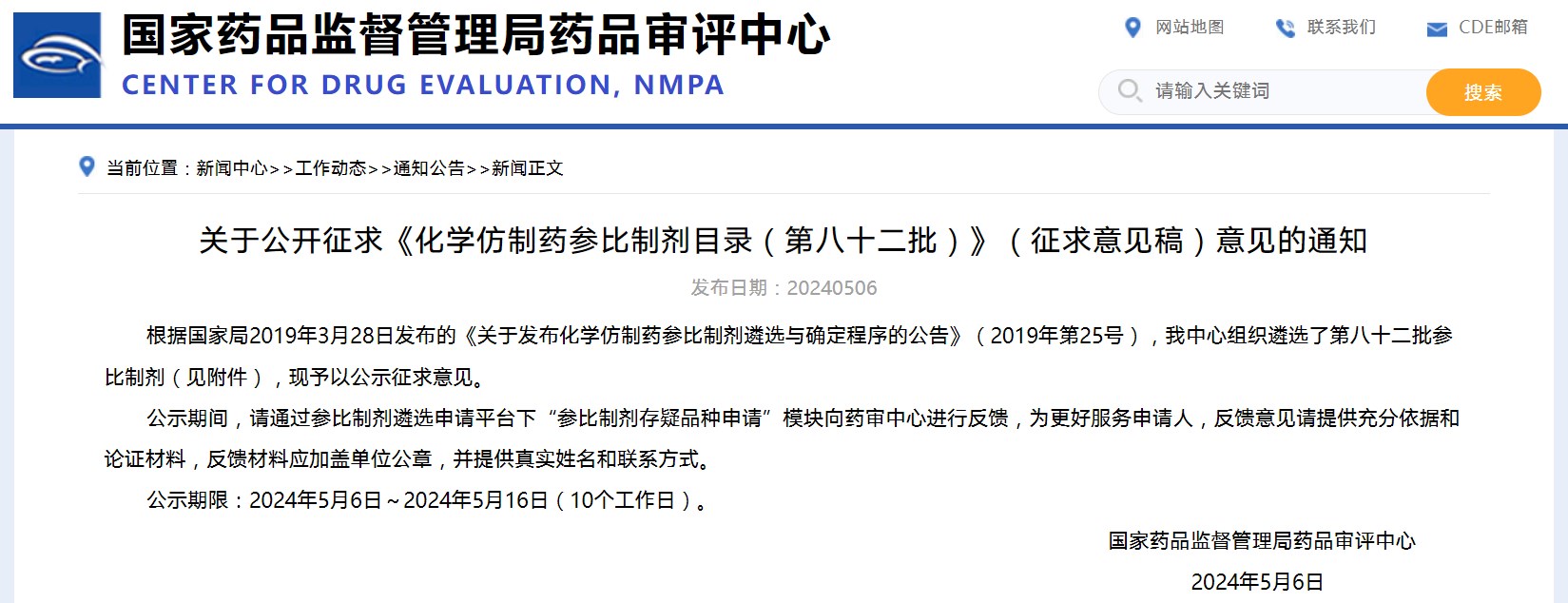 關(guān)于公開征求《化學(xué)仿制藥參比制劑目錄(第八十二批)》(征求意見稿)意見的通知