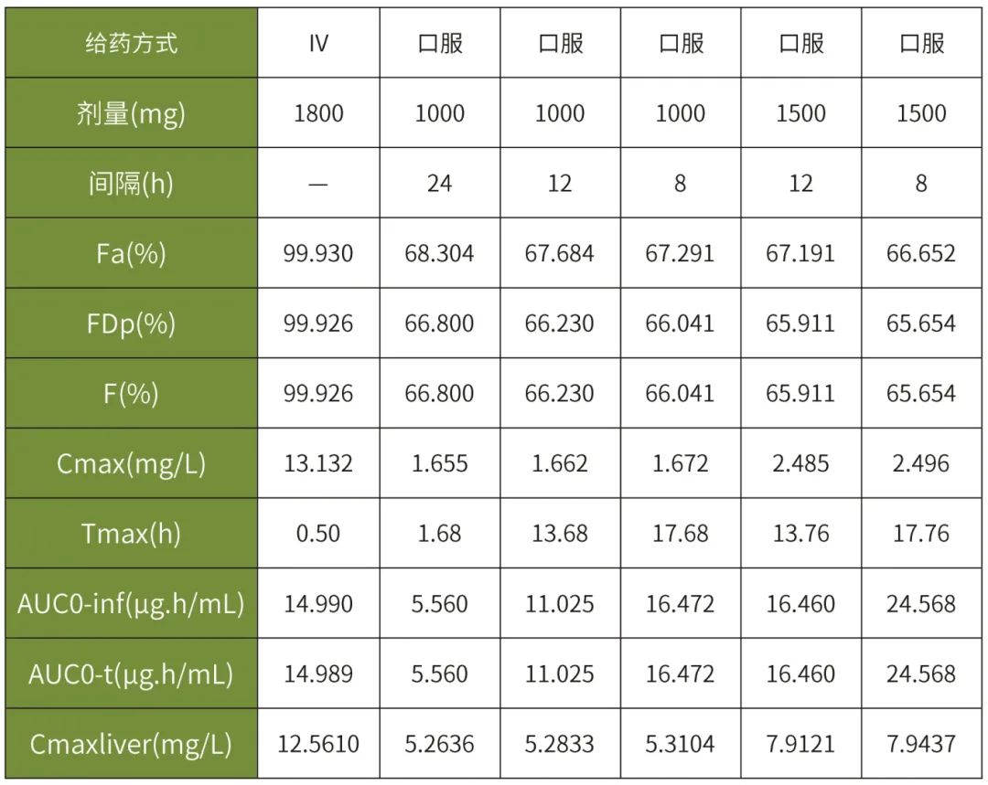 所有口服給藥的研究方案中所預(yù)測的Cmax均低于靜脈推注的結(jié)果(模擬最大的Cmax為2.496mg/L,為每日三次給藥1500mg片劑后預(yù)測值)。